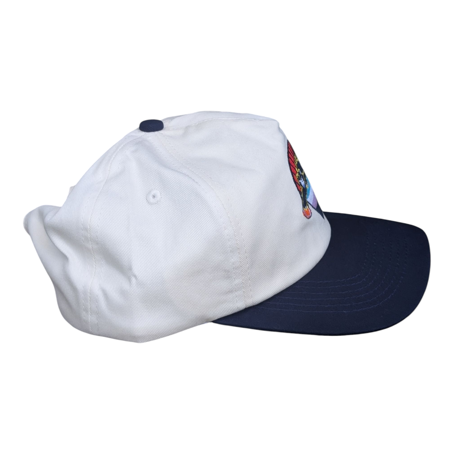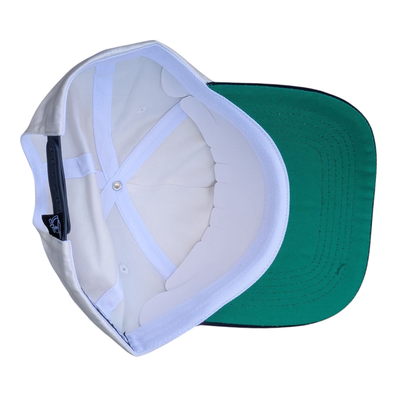 A nod to vintage cap style, this 5-panel ball cap pairs light and dark cotton twill with intricate front embroidery. Built with a soft-structured, mid-profile crown, it strikes the balance between durability and comfort. The green under-brim adds a vintage touch, while the navy snapback closure keeps the fit adjustable. Wear it flat or curved. Limited stock.