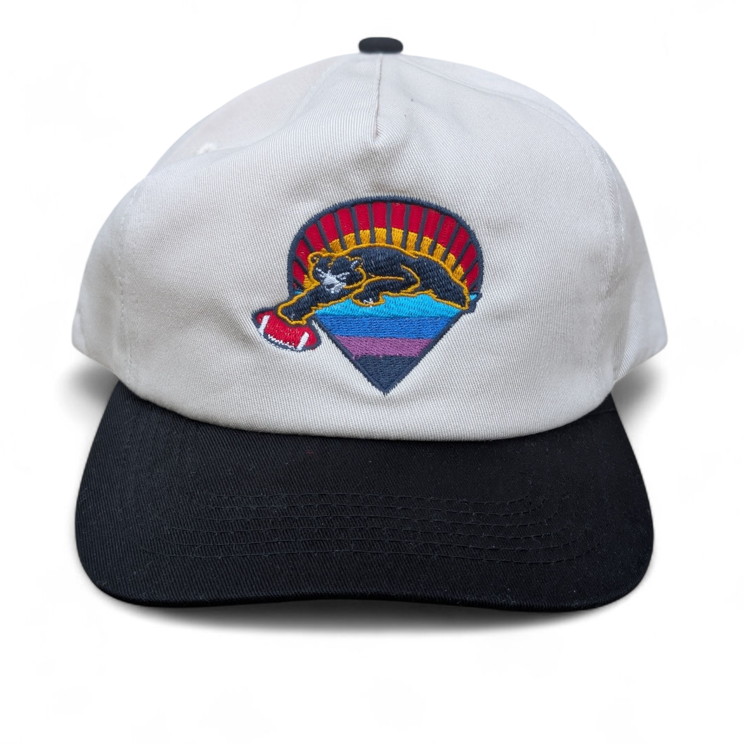 A nod to vintage cap style, this 5-panel ball cap pairs light and dark cotton twill with intricate front embroidery. Built with a soft-structured, mid-profile crown, it strikes the balance between durability and comfort. The green under-brim adds a vintage touch, while the black snapback closure keeps the fit adjustable. Wear it flat or curved. Limited stock.