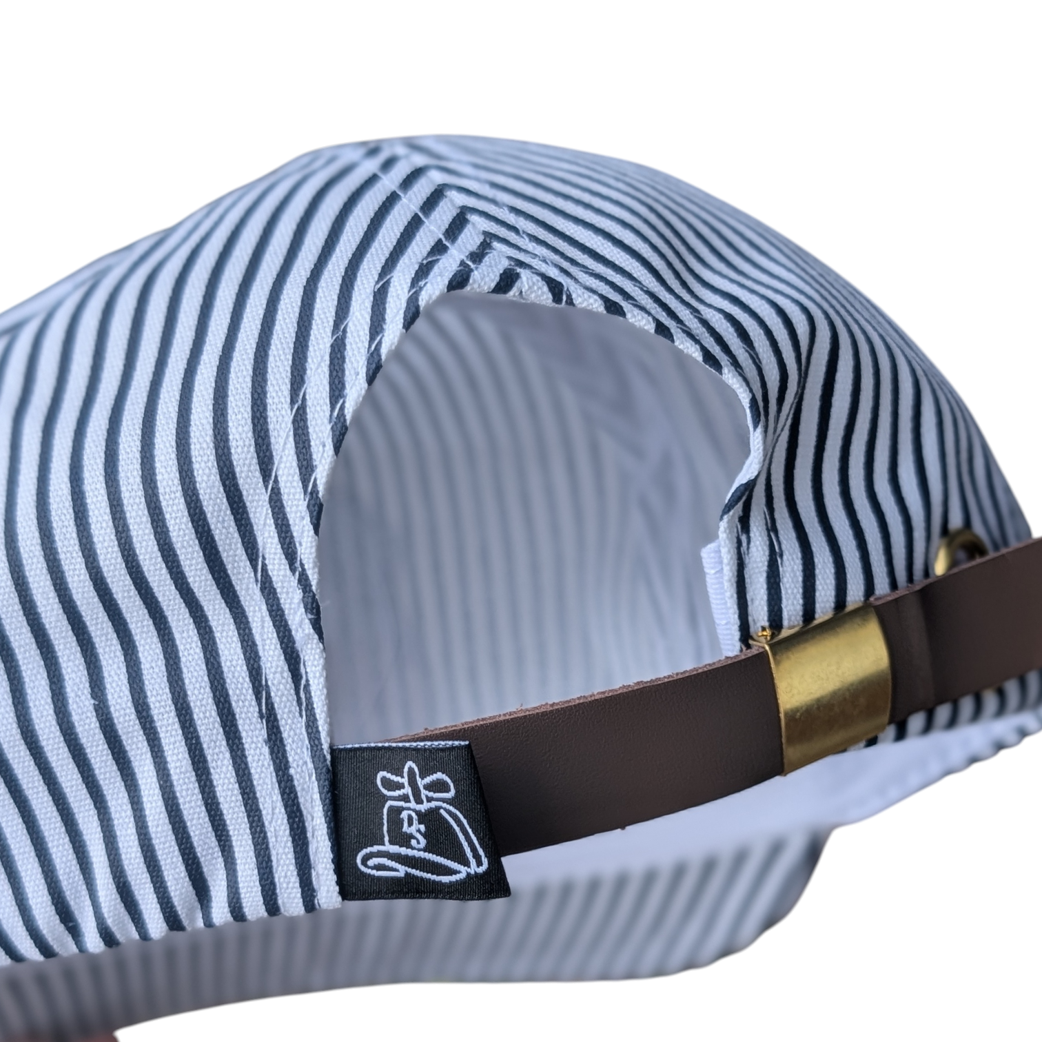Classic 5-panel design crafted from blue hickory striped canvas for a timeless, worn-in look. The unstructured crown offers a relaxed fit, finished with a brown leather strap back for easy adjustment.